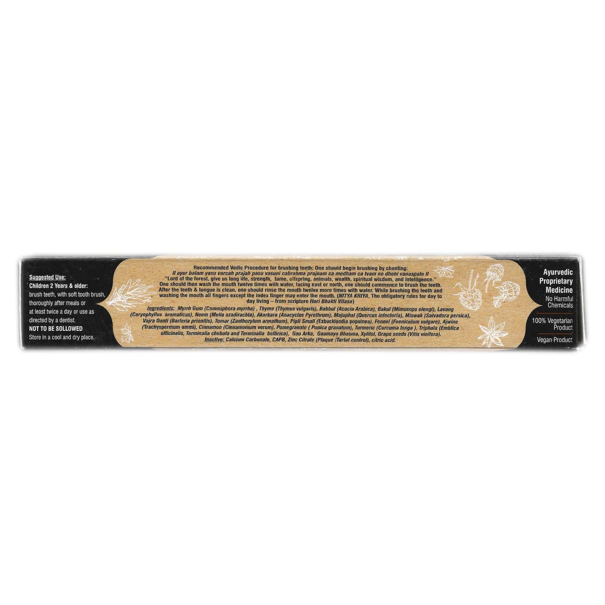 Myrrh Gum, Thyme, Babool, Bakul, Lavang, Neem, Akarkara, Majuphal, Miswak, Vajra Danti, Tomar, Pipli Small, Fennel, Ajwain, Cinnamon, Pomegranate, Turmeric, Triphala, Gau Arka, Gomaya Bhasma, Xylifol, Grape Seeds, and a natural foaming base
